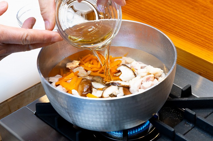 シンプルな炊き込みご飯ですが、素材の風味や食感を活かすための細やかな配慮があります。椎茸、ニンジン、鶏肉は調味液で煮た後にザルに取り分け、調味液のみ米、ごぼうと合わせて炊飯。香りと歯応えを楽しむ野菜のごぼうは煮込まずに、炊飯の段階で加えることで特徴を引き出すことができます。取り分けた具材は蒸らしのタイミングで合わせることで、ジューシーな鶏肉の味が活きた炊き上がりになります。