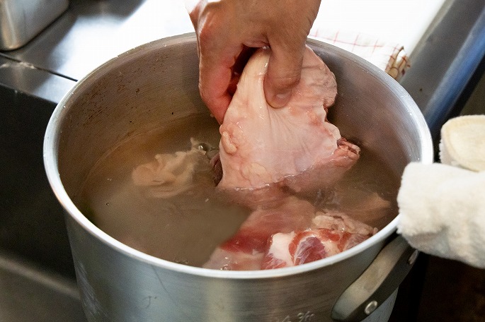 一度もフタをすることなく、80℃前後の湯温を維持しながらコトコトと3〜4時間炊き続けます。肉に鉄串がすっと通るくらい柔らかくなったら、キャベツを加えてさらに10分ほど弱火で炊きます。