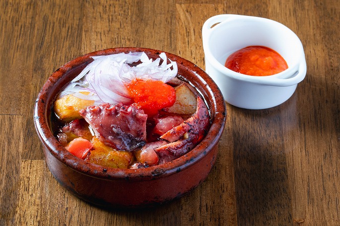 「ラガレイロ」とはポルトガル語で「搾油所の人」という意味で、タコとジャガイモにオリーブオイルをたっぷりかけてオーブン焼きする郷土料理です。現地では平らな皿に盛り付けられることが多いのですが、クリスチアノではカスエラ風の深皿を使ってアヒージョ風に煮込んで提供しています。