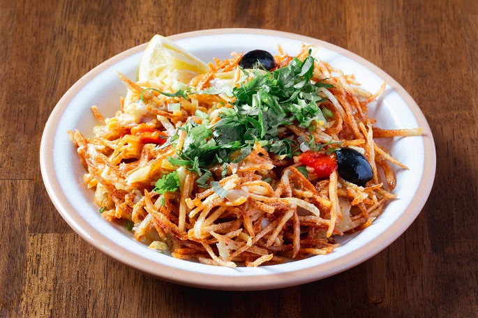 バカリャウと玉ネギ、細切りのフライドポテトを炒めたところに溶き卵を回しかけ、ふんわりとほどよく固まったところで完成。最後にオリーブ、イタリアンパセリをのせてレモンを軽くしぼります。