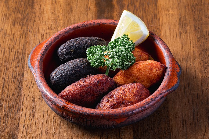 1個10gほどの小ぶりな見た目が愛らしい、自家製バカリャウ(干し鱈)とジャガイモのコロッケです。ポルトガルの定番おつまみとして知られ。タラのうま味とジャガイモのホクホク感が人気です。プレーン(写真手前)、カレー(右)、イカ墨(左)の3種類を用意。一皿6個入りで、1〜3種から選べます。