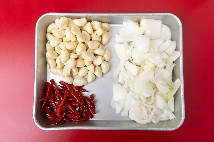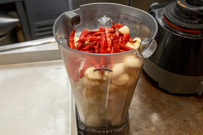 甘さと辛さが絶妙なバランスのスープ。そのベースとなる「ラクサペースト」を作っていきます。玉ネギやニンニク、赤唐辛子などの香味野菜をミキサーでしっかりとペースト状にします。あらかじめペースト状に攪拌しておくことで、水分が飛びやすくなり、炒める工程の時短にもひと役買っています。なめらかな舌触りのスープに仕上げるためにも、丁寧にミキサーをかけることがポイントです。