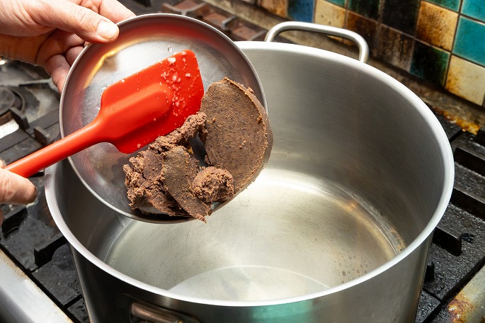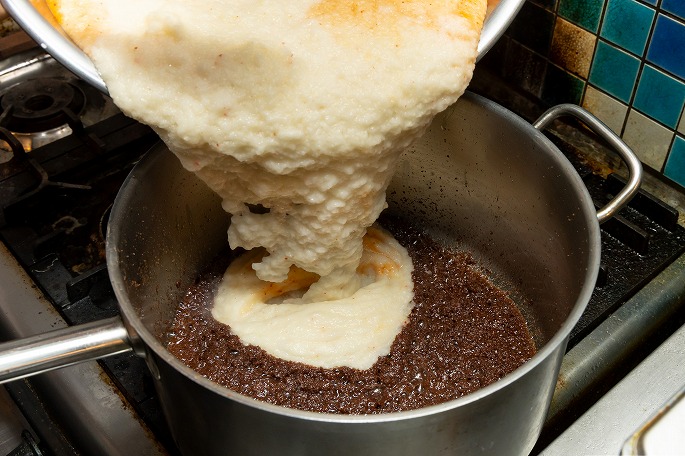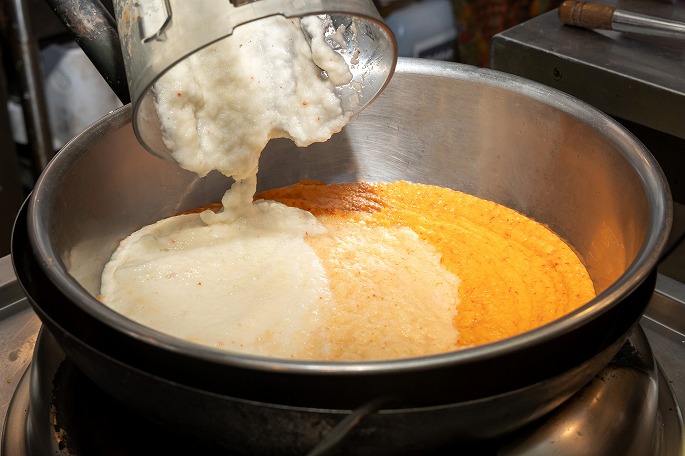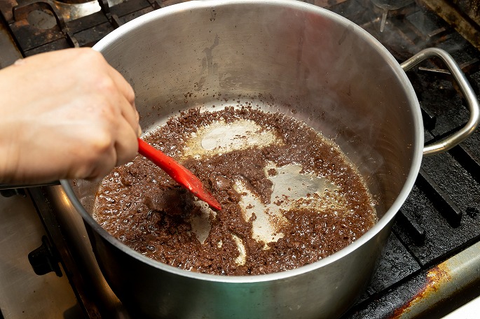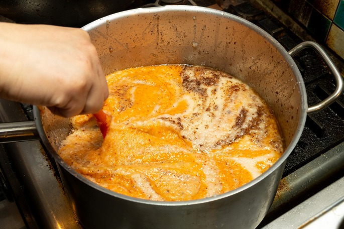 油をひいた鍋に加えるのは、東南アジアの発酵調味料「ガピ」。オキアミなどの小エビを塩漬けにして発酵させたもので、“シュリンプペースト”とも呼ばれます。「ガピ」は、タイ料理のトムヤムクンなどにも使われるエビ味噌のようなもの。強い香りとコクが特徴でスープに深みを加えてくれますが、特有の臭みもあるので、それを飛ばすイメージでしっかり火を入れ、エビの香りと香ばしさを油に移していきます」と佐藤さん。