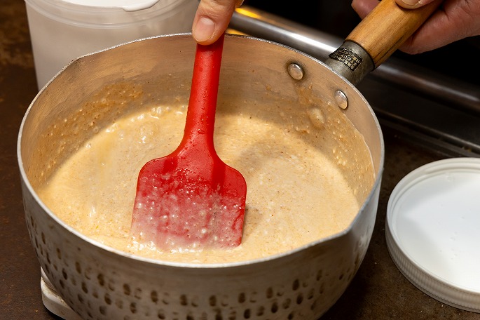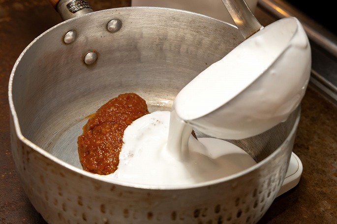 スープは、オーダーが入ってから仕上げます。ラクサペーストとココナッツクリームを1:2の割合で合わせたら、さらに同量の水を加えて温めていきます。「ココナッツはミルクではなく、クリームを使うのがポイント。ミルクよりも脂肪分が高く、味に厚みが出て、コク深く濃厚なスープに仕上がります。本店ではランチにごはんを添えて提供していることもあり、“お米に合う味”であることも意識しています。カレーみたいにごはんにかけても、めちゃくちゃおいしいんですよ」。
