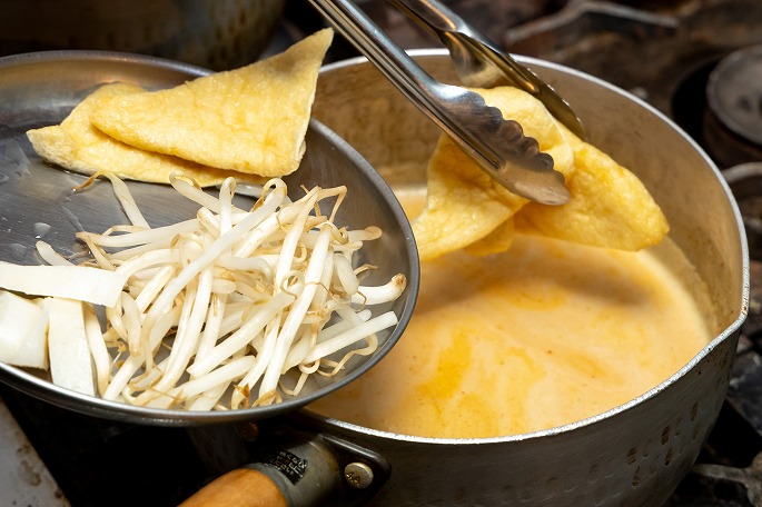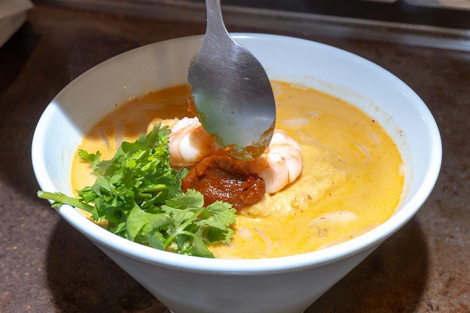 スープに、油揚げ・もやし・かまぼこなどの具材を加え、あらかじめ水で戻しておいた米粉麺も投入します。「シンガポールでは、ラクサに合わせる麺は丸い米粉麺や細いビーフンなど、お店によってさまざま。試作を重ね、うちでは濃厚スープに負けないインパクトのある“幅広の平たい米粉麺”を選びました。米粉麺は表面がつるっとしていてスープを吸いにくいので、煮込んでしっかりとスープをまとわせます」。最後に茹でた剥きエビ、コリアンダー、サンバル(唐辛子とニンニクをベースとした辛味調味料)を盛り付けたら出来上がりです。