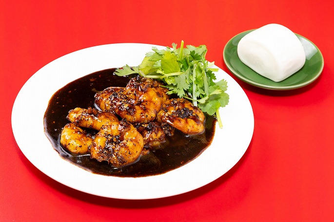 ブラックペッパーソースは、シンガポール料理では定番の味。味付けは醤油とブラックペッパーのみというシンプルな構成で、使用するのはとろみとやさしい甘味が特徴の中国産濃口醤油。日本のたまり醤油にも似た風味ながら塩気は控えめで、見た目の印象よりも軽やかな味わいです。添えられた蒸しパン(マントゥ)に、たっぷりとソースをつけて召し上がれ。