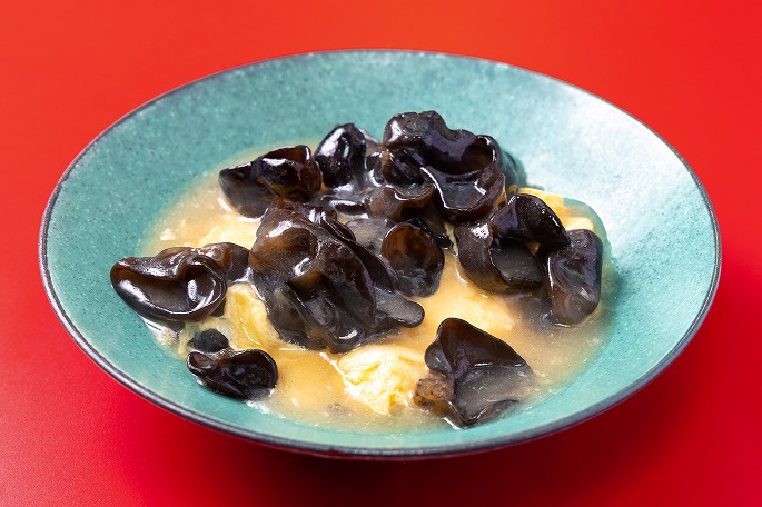 やさしい味わいのシンプルな料理は、中国・広東省の料理・ムースーロー(木須肉)がルーツ。「ムースーローは豚肉やオイスターソースを使い、濃いめの味付けでごはんの進む“おかず”ですが、うちでは “箸休め”的な感覚で楽しんでいただいています」。卵はだし巻き玉子をイメージして鍋の中で折りたたむように静かに火を通し、味つけは醤油のみ。たっぷりの鶏スープにとろみをつけてあんかけ風に仕上げ、きくらげにふんわりと絡ませます。どこか和の趣がただよう、大人好みのひと皿です。